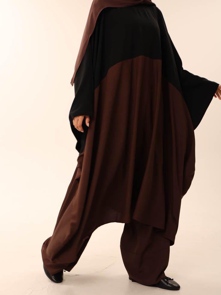 Mocha Flow redefines relaxed dressing with modest elegance. Designed as a coordinated set in warm mocha and black tones, this flowy ensemble moves with ease while keeping structure intact. The silhouette is modest yet contemporary—perfect for those who embrace faith and fashion with equal fluidity. Ideal for travel, errands, or unhurried days that still call for style.