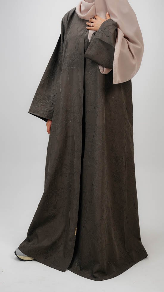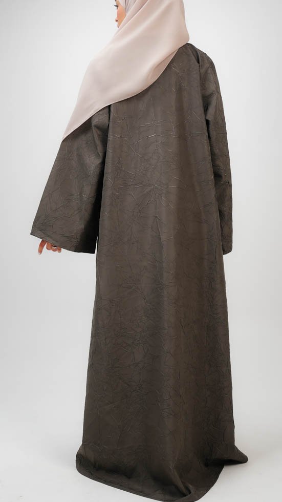 A textured olive-toned abaya that brings together natural grace and minimalist design. Paired with a soft beige sheila for a warm, grounded finish.