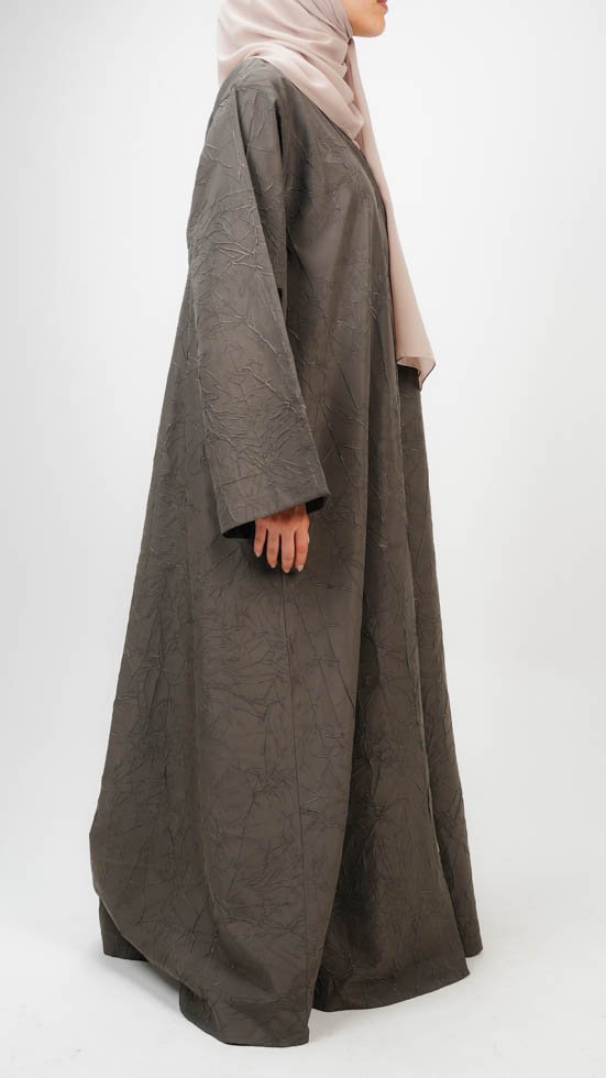 Olive Crinkle is for those who find beauty in simplicity. With its soft crinkled texture and calming olive hue, this abaya speaks in quiet tones. The unstructured flow flatters without effort, while the accompanying beige sheila introduces a delicate contrast. It’s a piece that feels rooted—balanced between tradition and modernity, between softness and strength. Modesty here feels intuitive, wrapped in the warmth of natural textures and grounded elegance.
